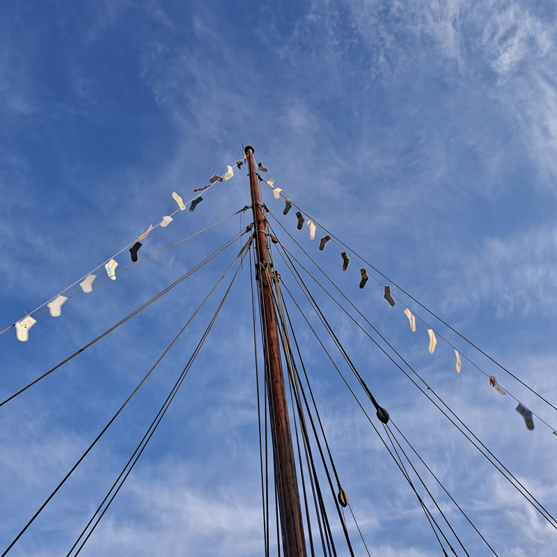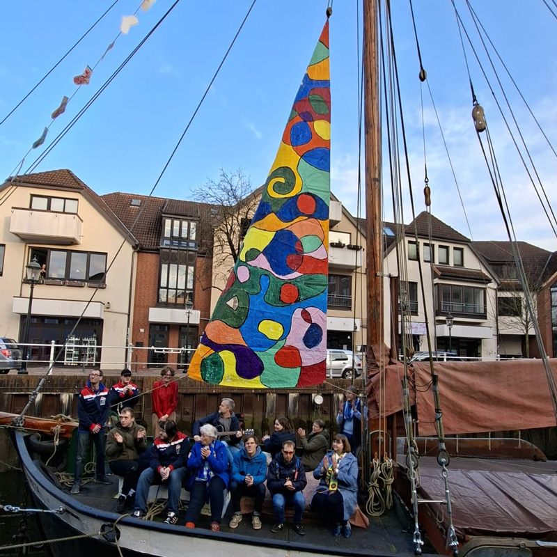 Vom Bug über den Mast bis zum Heck spannt sich jetzt ein langes, buntes Band durch die Luft – mitten im Fleth der historischen Buxtehuder Innenstadt. Jeder, der vorbeikommt, kann es sehen.
